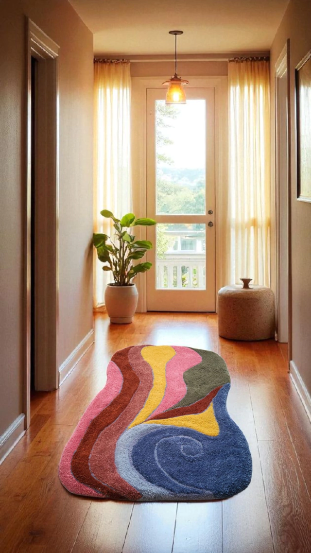 Alfombra tejida a mano en lana acrílica. Punch needle con pelo largo y detalles manuales.