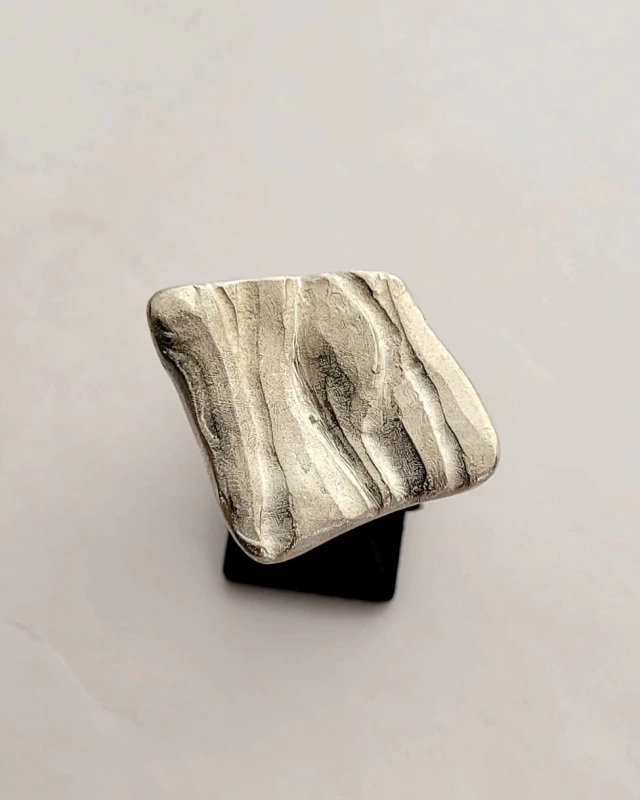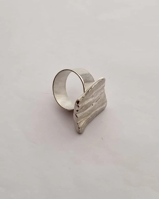 Esta pieza es parte de la Colección Cortezas, en la que a partir de pequeños trozos de cortezas seleccionadas cuidadosamente y luego fundidas en bronce o Plata 925, se realiza una pieza única. En este caso, la cinta que conforma el aro del anillo (de un ancho de 0,9 mm y espesor de 0,7 mm) es lisa y contrasta con la “tapa” proveniente de la fundición (que tiene unas medidas apx. de entre 1,5 y 2 cm por lado). Todo realizado en Plata 925.