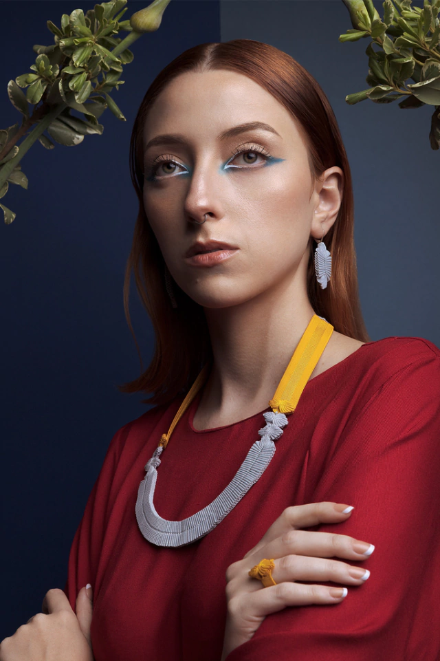 Collar Belona, combinado gris claro y amarillo. 18 x 24 x 0,5 cm.