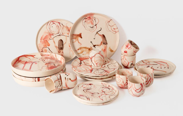 Vajilla de cerámica pintada a mano por la artista Mariana Cannizzaro.