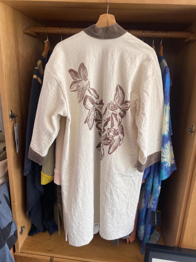Kimono de lino vintage con detalles de terciopelo en cuello, puños y bolsillos. Géneros teñidos artesanalmente. 100% algodón. Serigrafía con estampa Orquídeas.