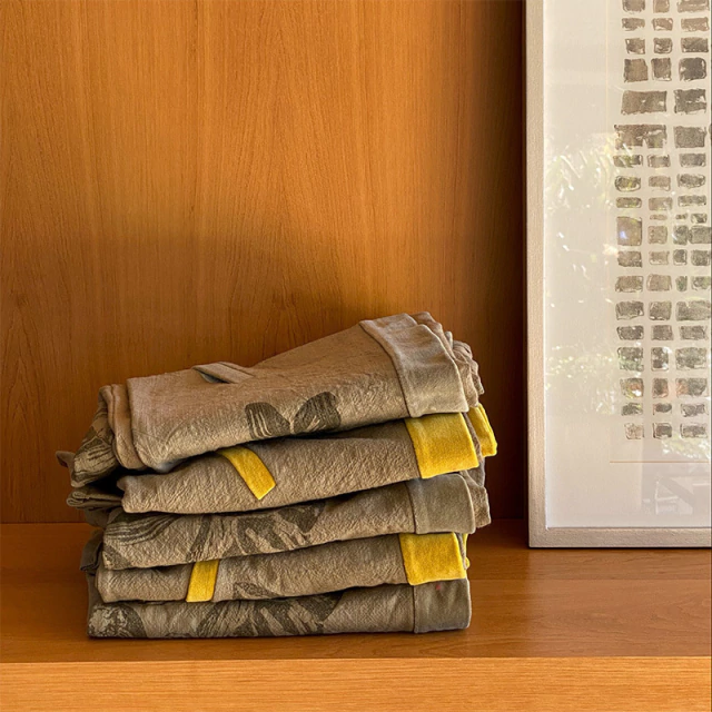 Kimono de lino vintage con detalles de terciopelo en cuello, puños y bolsillos. Géneros teñidos artesanalmente. 100% algodón. Serigrafía con estampa Orquídeas.
