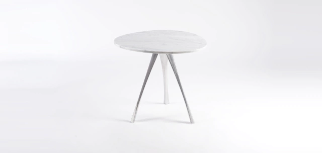 Mesa Blossom de arrime. Realizada en aluminio y mármol.