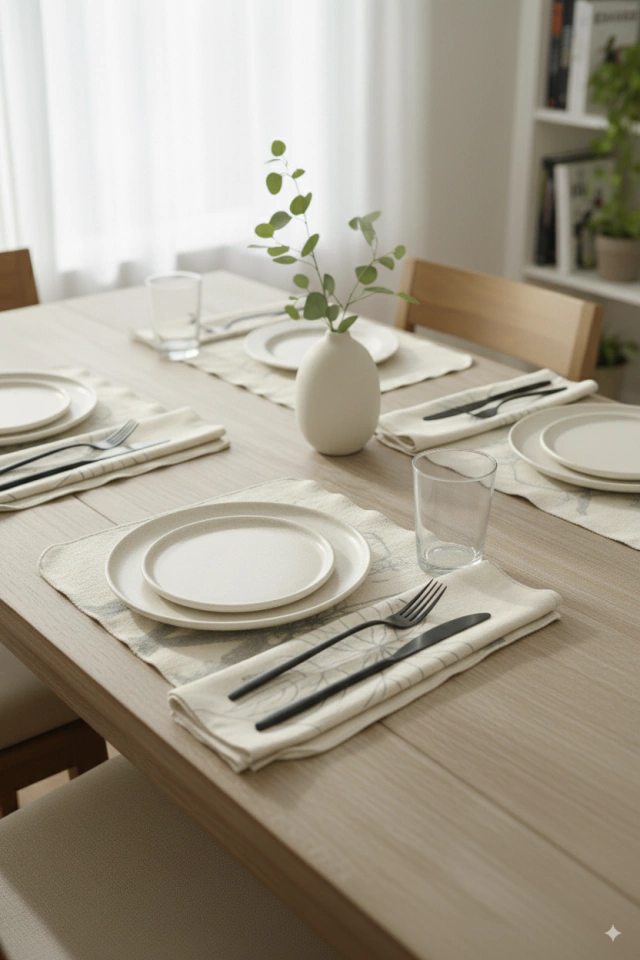 - 6 Individuales de tussor crudo, 100% algodón. Estampados a mano con serigrafía metalizada. 52 x 38 cm c/u.