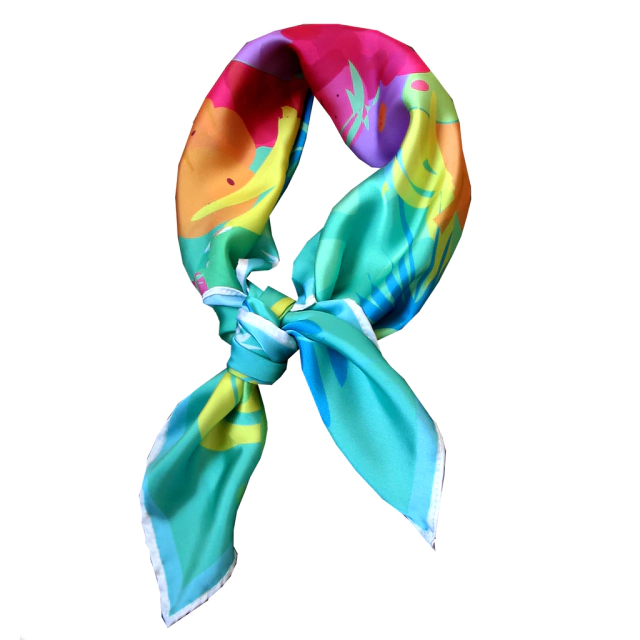 La artista visual Valeria Vilar diseña esta colección de pañuelos de seda en línea con la estética de sus obras. Valeria se inspira en imaginarios sobre cuentos, sueños y lugares de fantasía. Los pañuelos son obras para ser usadas.