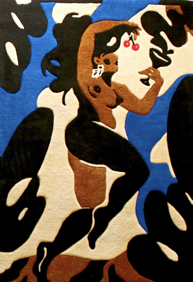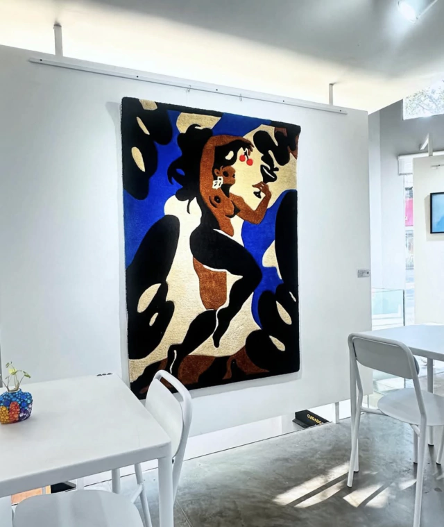 Obra textil realizada artesanalmente mediante la ténica de tufting con lana acrílica. Se puede usar como Tapiz colgante mediante sistema de ganchos en la parte trasera o como Alfombra retirando dicho sistema.