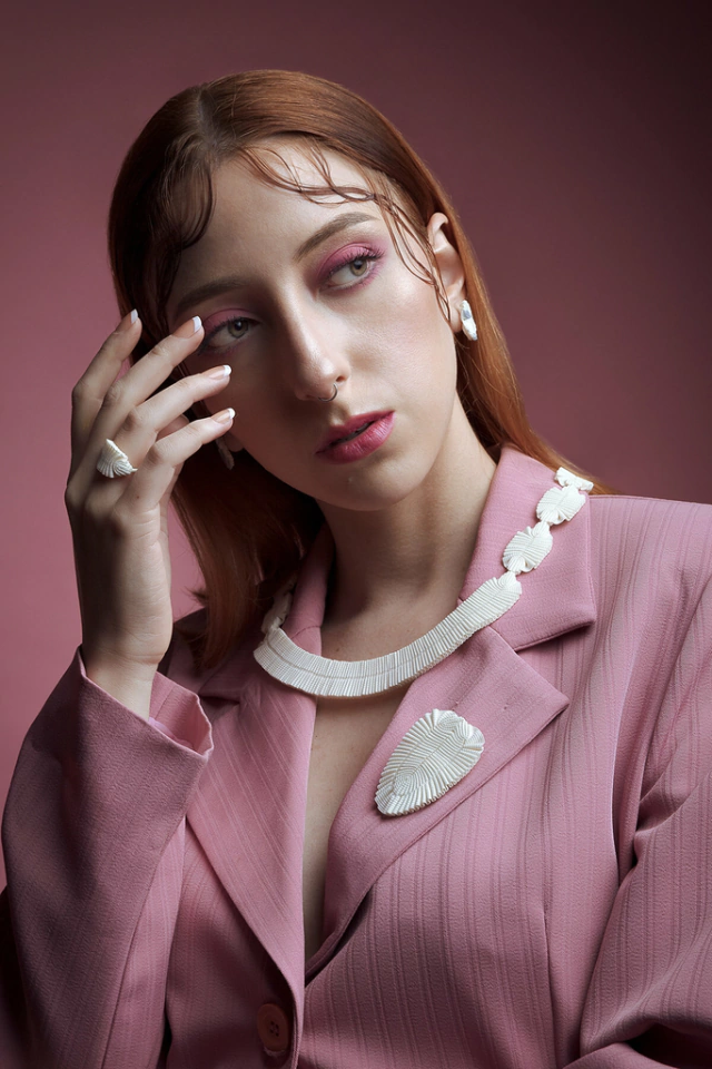 Pieza realizada con materiales textiles y una película selladora que protege la pieza alargando la vida del material y conservando su apariencia original. Confeccionada a mano a partir de la experimentación con materiales textiles elásticos en una búsqueda entre el arte y el diseño.