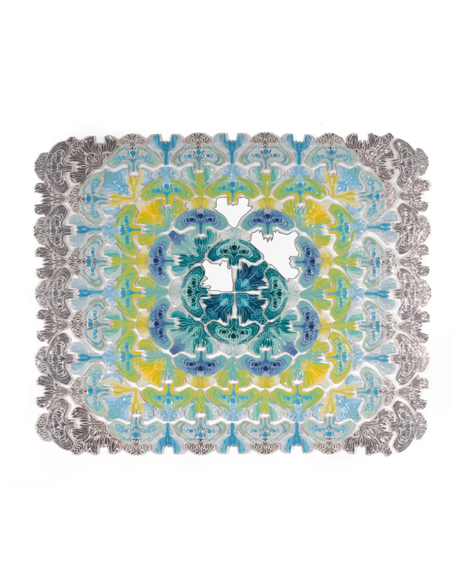 Nueva serie de utilitarios cerámicos que combina la obra de Gabriel Baggio Motivo para bandeja de té, interpretación libre de una bandeja de hojalata para servir té de fabricación inglesa, con el proyecto de Amadeo Azar Acto reflejo. Modifican la obra de Baggio para generar una nueva variante que podría sintetizarse en la fórmula utilitario / obra de arte para repensar la idea de uso y función en la práctica artística contemporánea.