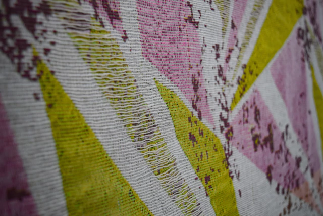 Tejido Jacquard industrial experimental con estructura alterada para producir vacíos, rupturas y transparencias como parte de la composición.